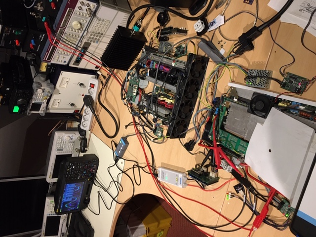 Das Netzteil unten im Bild wird vermessen. Die Messwerte werden über einen Stromzange und Hochspannungs-Differenz-Tastkopf erfasst.