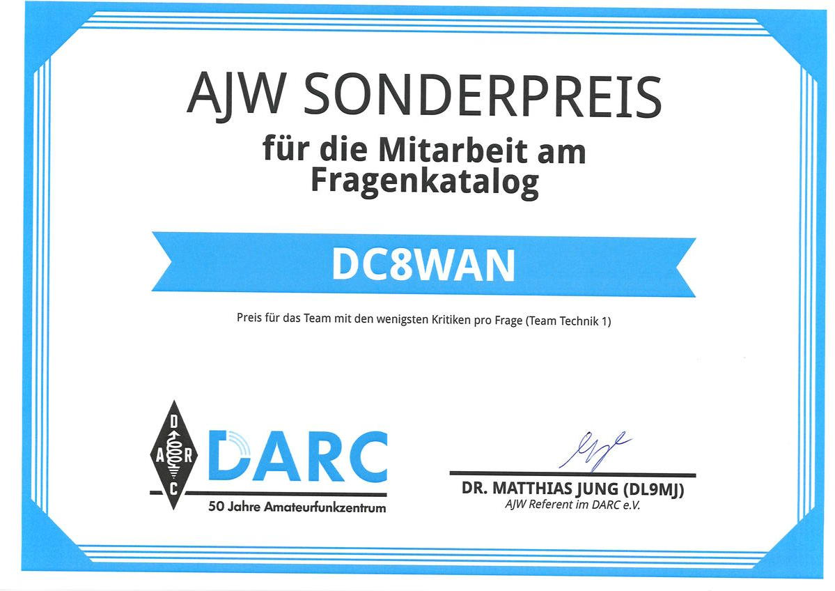 Auszeichnung für die Mitarbeit beim erstellen des neuen Amateurfunk-Fragenkatalog erhalten